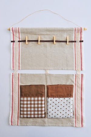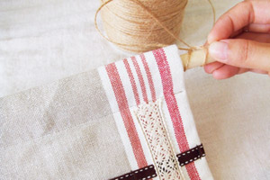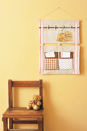 布不再只是平面的應用,串聯起來加上唯美的蕾絲相稱,放入木棍直接吊掛在牆面上,收納信件、明信片的信插即可點綴牆面空間。