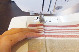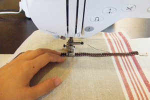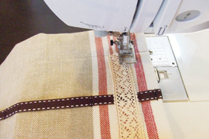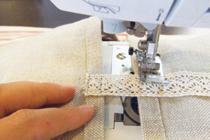 step 4 在餐墊的兩側車縫上蕾絲裝飾。