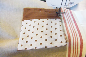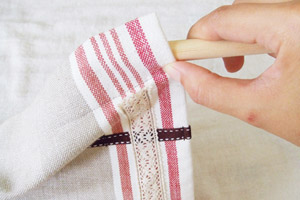 step 7 將木棍穿過第一塊餐墊已車縫的上緣。