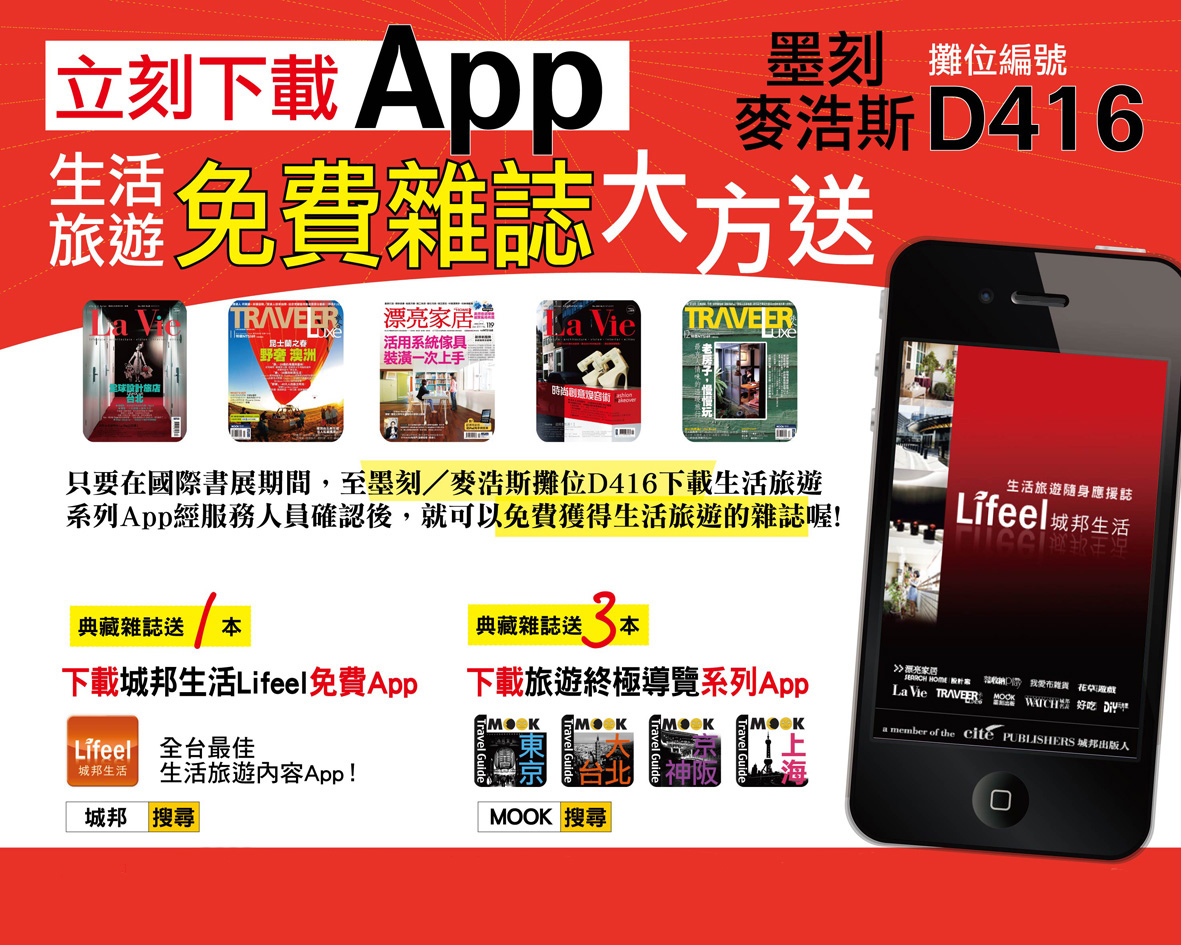 睽違一年的國際書展將於2/9一直到2/14號,總共為期6天喔!此次書展除了有暢銷套書下殺55折、超優的雜誌訂閱好康外,要特別告訴你一個簡 單拿免費雜誌的機會喔!凡是在國際書展期間,只要持iphone手機,至麥浩斯/墨刻攤位(D416),下載購買旅遊終極導覽系列App之一,經服務人員 確認後,就可以免費獲得旅遊的雜誌喔!一旦錯過就太可惜了!
